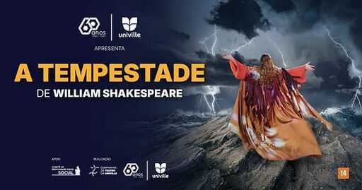 A Univille apresenta sua montagem de A Tempestade, de William Shakespeare, em São Francisco do Sul no dia 21 de março (sábado), às 19h, no Cine Teatro X de Novembro. A entrada é gratuita — o público poderá colaborar com a doação espontânea de 1 kg de alimento não perecível. Como as vagas são limitadas, os ingressos antecipados estão disponíveis pelo Sympla, ou na bilheteria do local, uma hora antes do espetáculo.