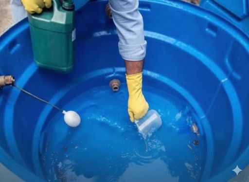 Adicione água sanitária na proporção de 1 litro para cada 1.000 litros de água. Para caixas menores, ajuste a quantidade proporcionalmente.