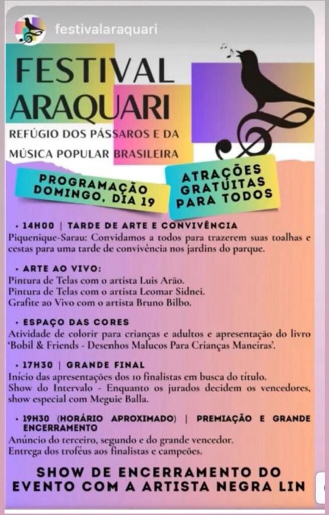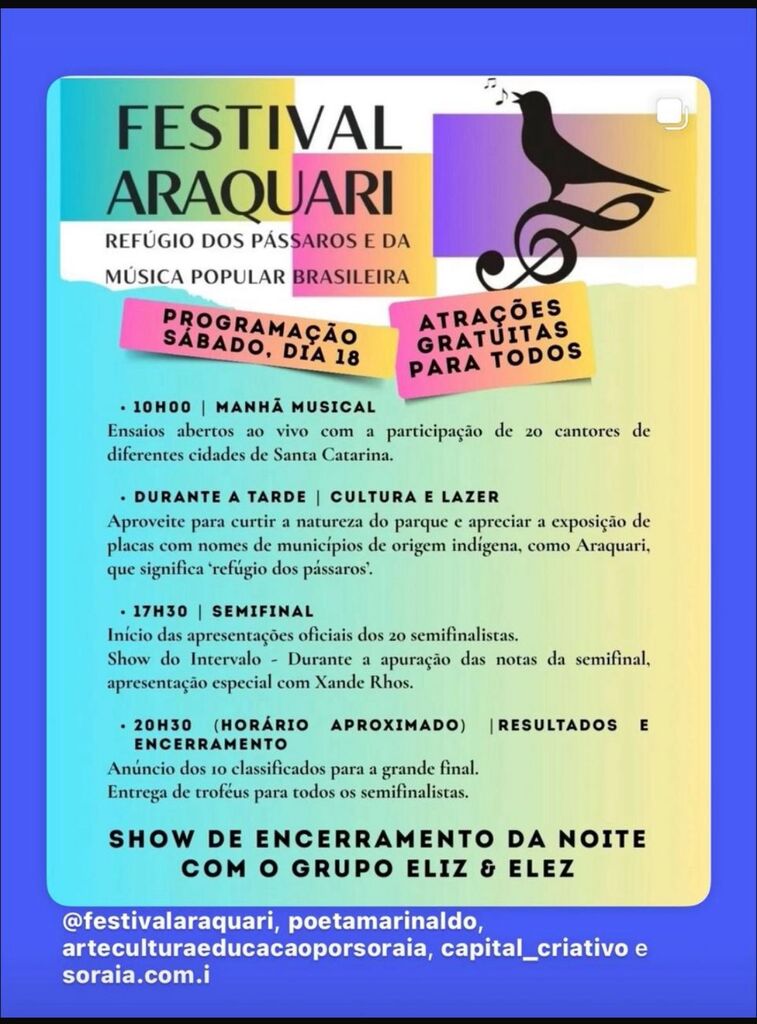 Dias 18 e 19 acontece o Festival Araquari - Refúgio dos Pássaros e da Música Popular Brasileira. Será o ponto de encontro perfeito para os amantes da boa música e da natureza!