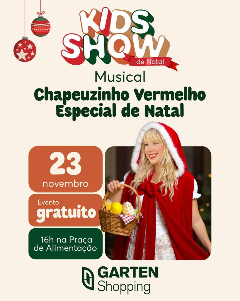 Já no domingo (23), também às 16h, é a vez do Palco Kids Show apresentar uma releitura encantadora do clássico Chapeuzinho Vermelho Especial de Natal. Com figurinos temáticos e