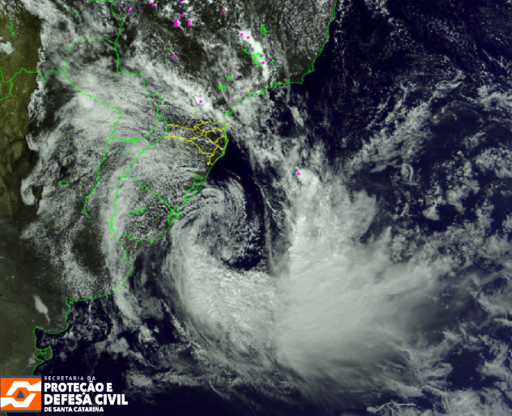 A frente fria que provocou temporais na noite de terça-feira (07) se afasta de Santa Catarina em direção ao oceano, permitindo a entrada de uma massa de ar frio e a redução das temperaturas em todas as regiões. Apesar da melhora gradual nas condições de tempo, os efeitos de um ciclone extratropical em alto-mar, entre o Uruguai e o Rio Grande do Sul, passam a influenciar o estado até hoje, quinta-feira (09).