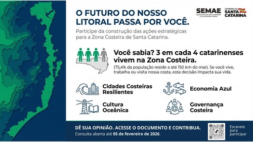 As contribuições podem ser encaminhadas até 05/02/2026, exclusivamente pelo e-mail geipa@semae.sc.gov.br. A participação da sociedade é considerada fundamental para garantir que o planejamento costeiro catarinense reflita, de forma efetiva, as necessidades, desafios e aspirações de quem vive, trabalha e se relaciona diretamente com o litoral.