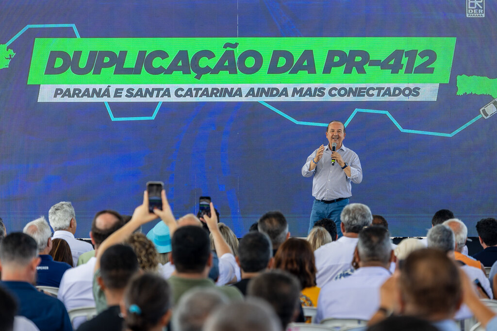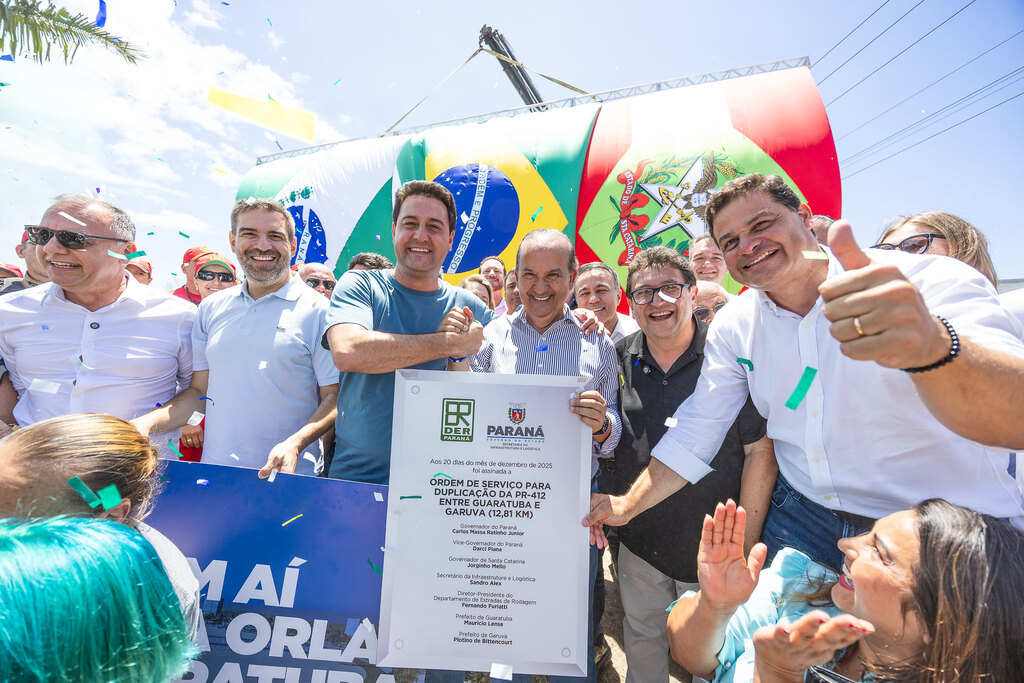 Quem circula pela região também vai ter o que comemorar quando passar de Santa Catarina para o Paraná. É que ao final da SC-417, começa a PR-412 até Guaratuba. E com a assinatura da ordem de serviço vão ser aplicados R$ 254,5 milhões em um trecho de 12,8 quilômetros a ser duplicado. A obra foi licitada no regime de contratação integrada, que contempla a elaboração do projeto básico e projeto executivo de engenharia, antes do início dos serviços no trecho em si. Com a formalização, começam os estudos e levantamentos dos projetos.